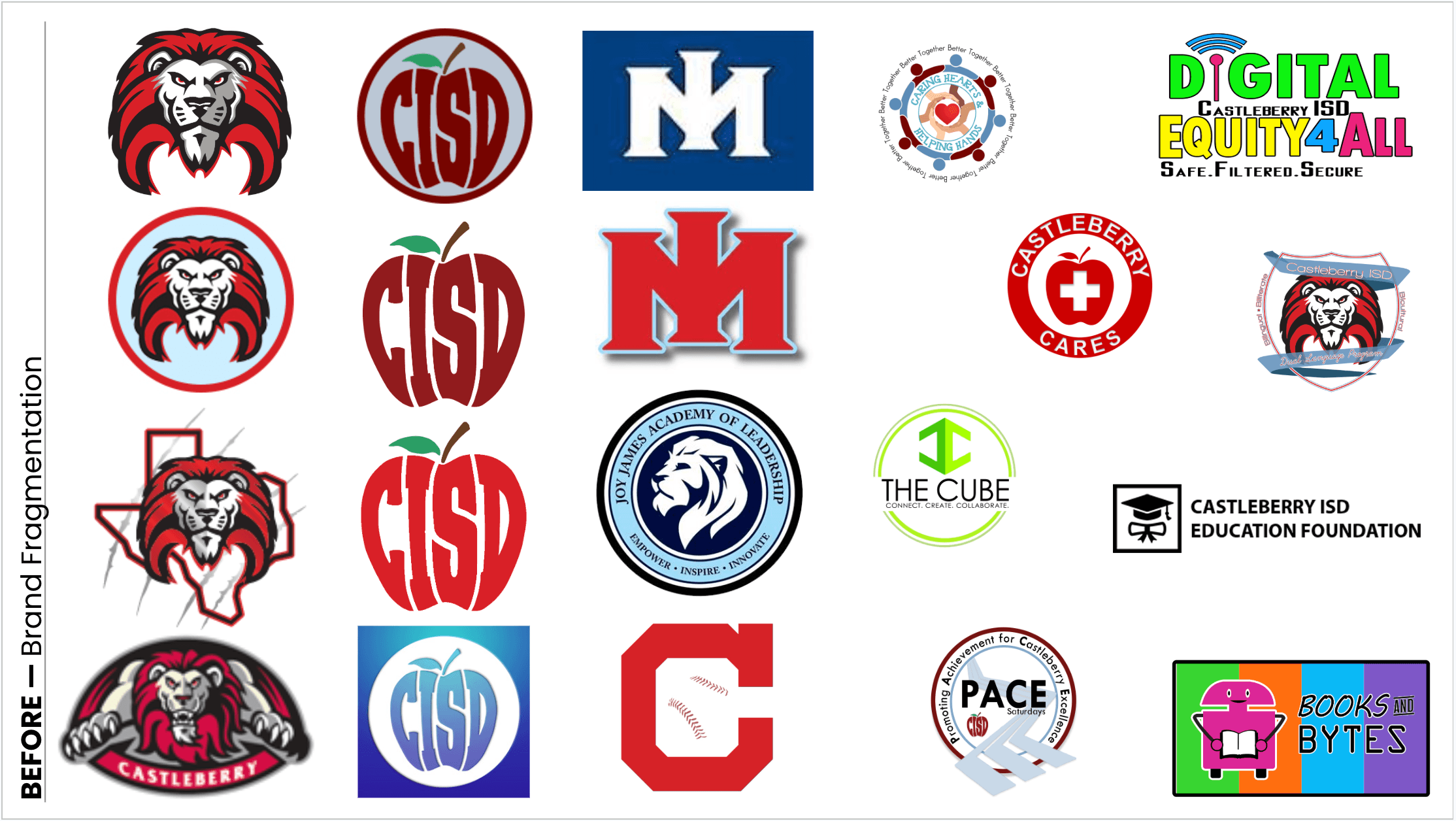 Prior to establishing a unified brand system, Castleberry ISD’s visual identity had expanded organically across campuses, programs, and initiatives.