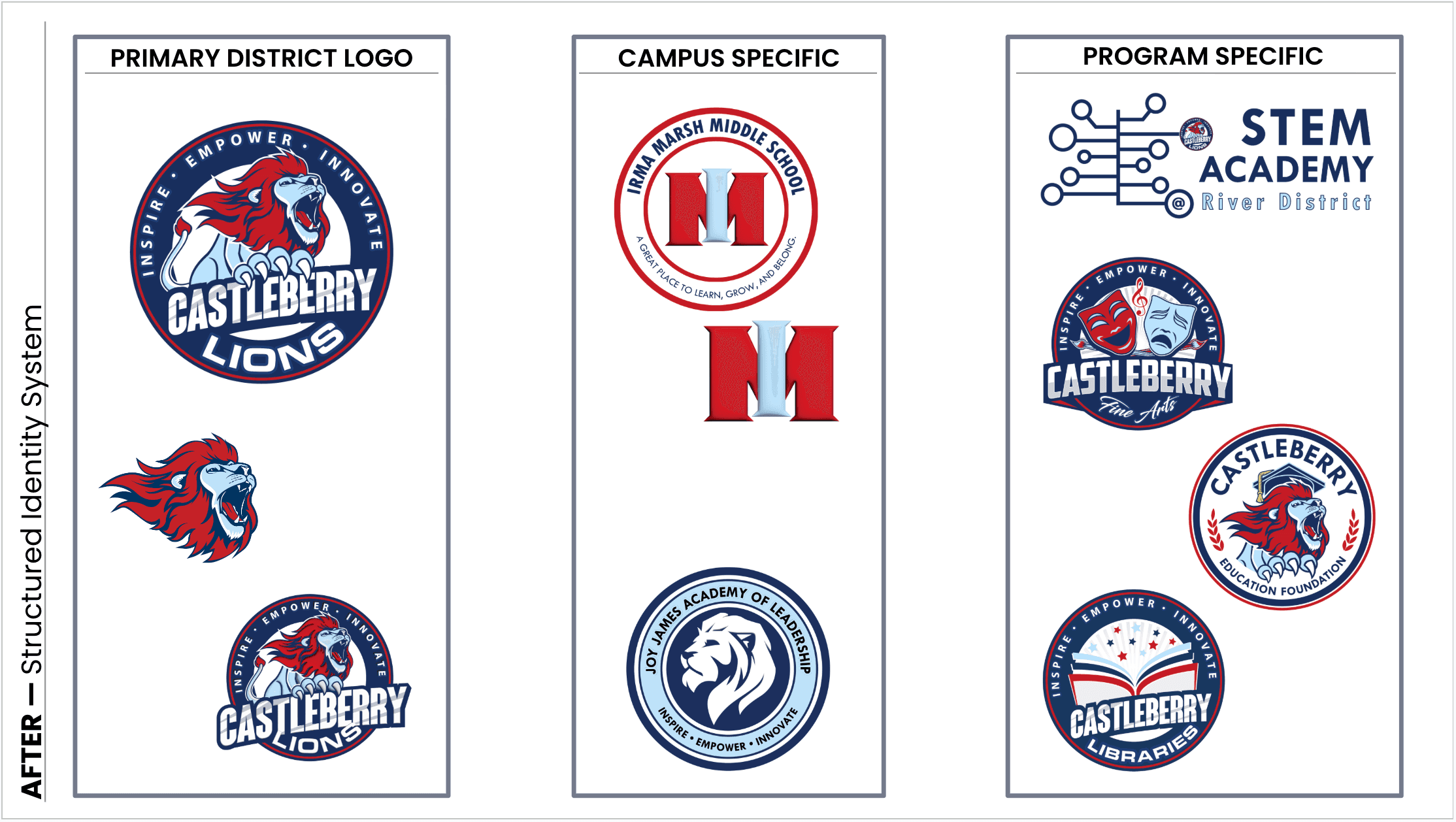 Established a unified district identity system with clear hierarchy for campuses and programs.