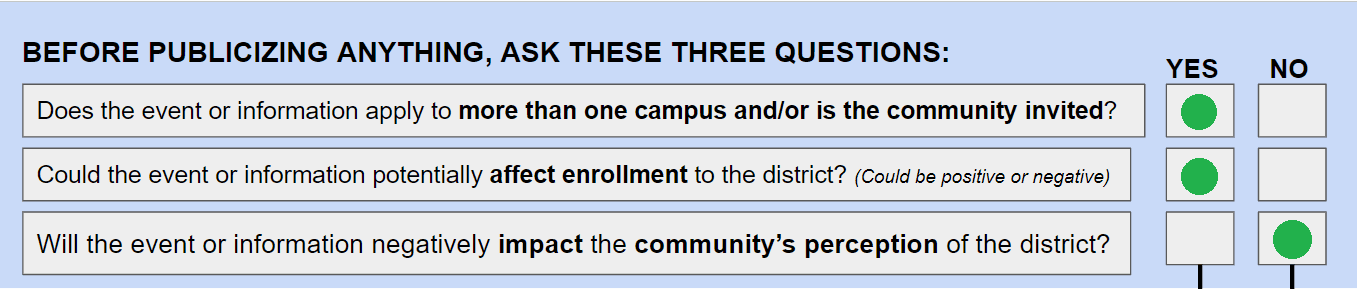 All communication should be disseminated from the most appropriate level—district, campus, or teacher—depending on the nature of the information and target audience. There are three questions identified in the communication process to determine this level.