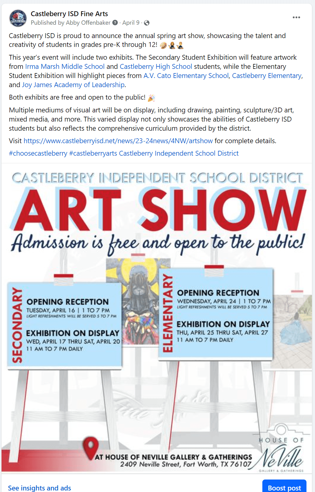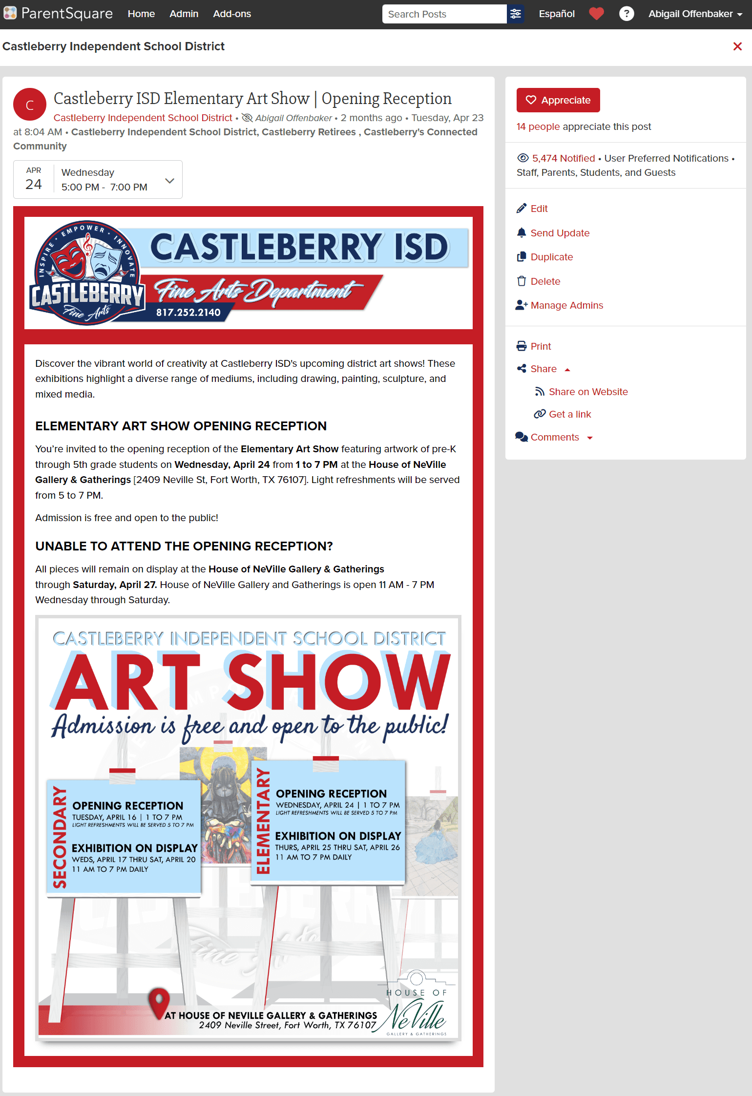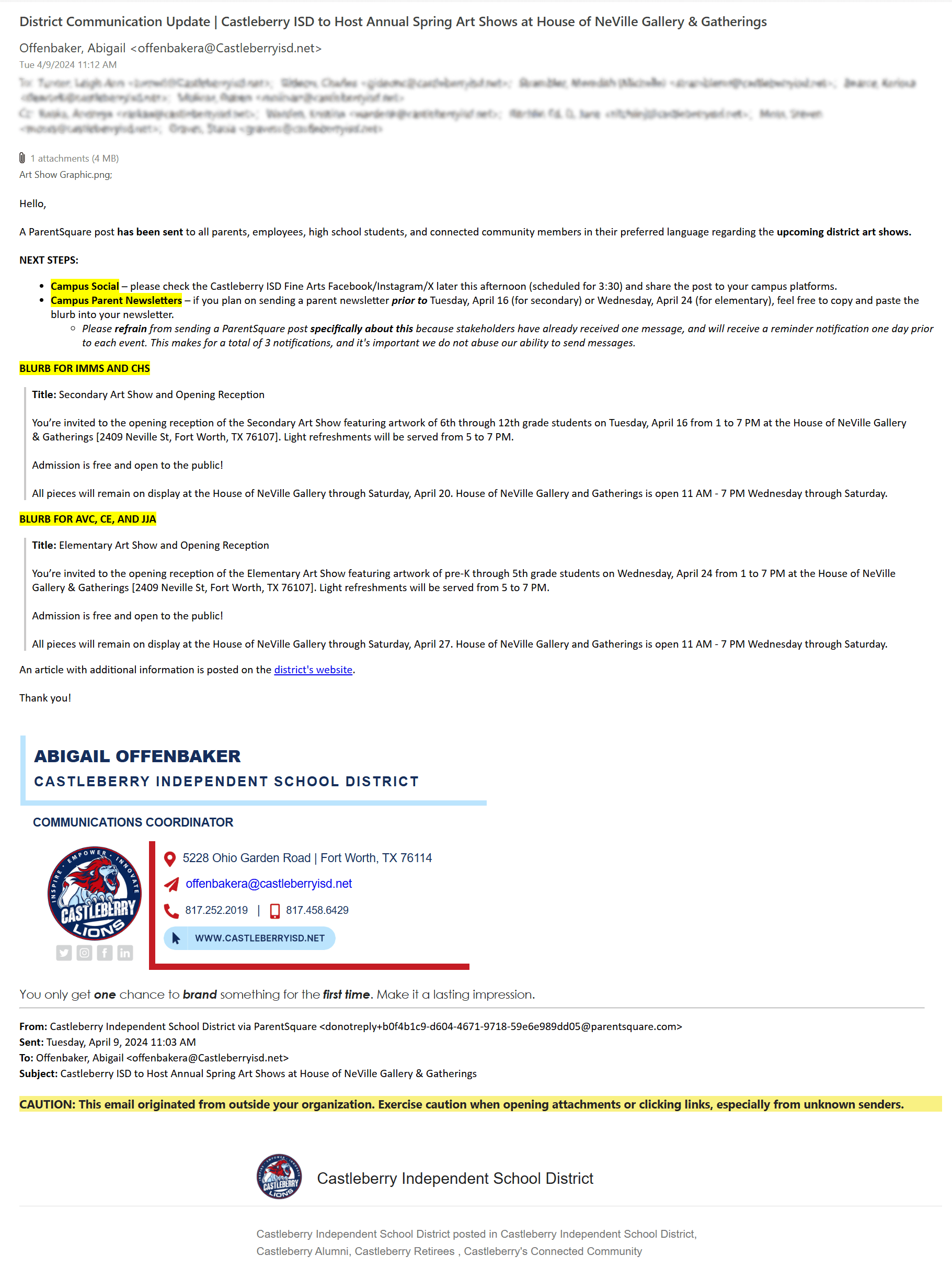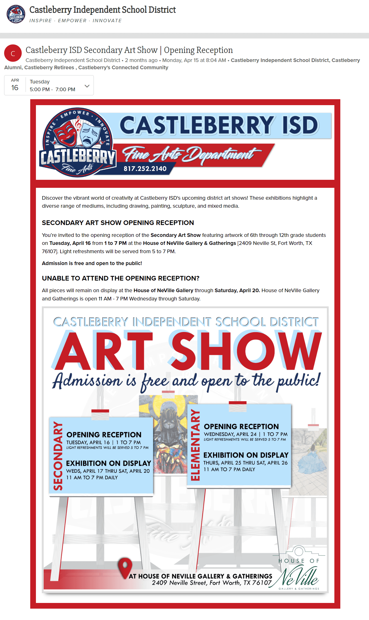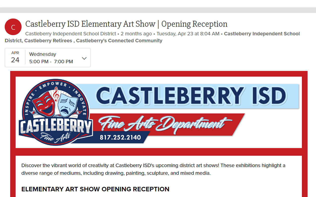 Specifically for the Spring Art Show, two of the questions can be answered with yes. As a result, this is an event that was communicated at the district level.