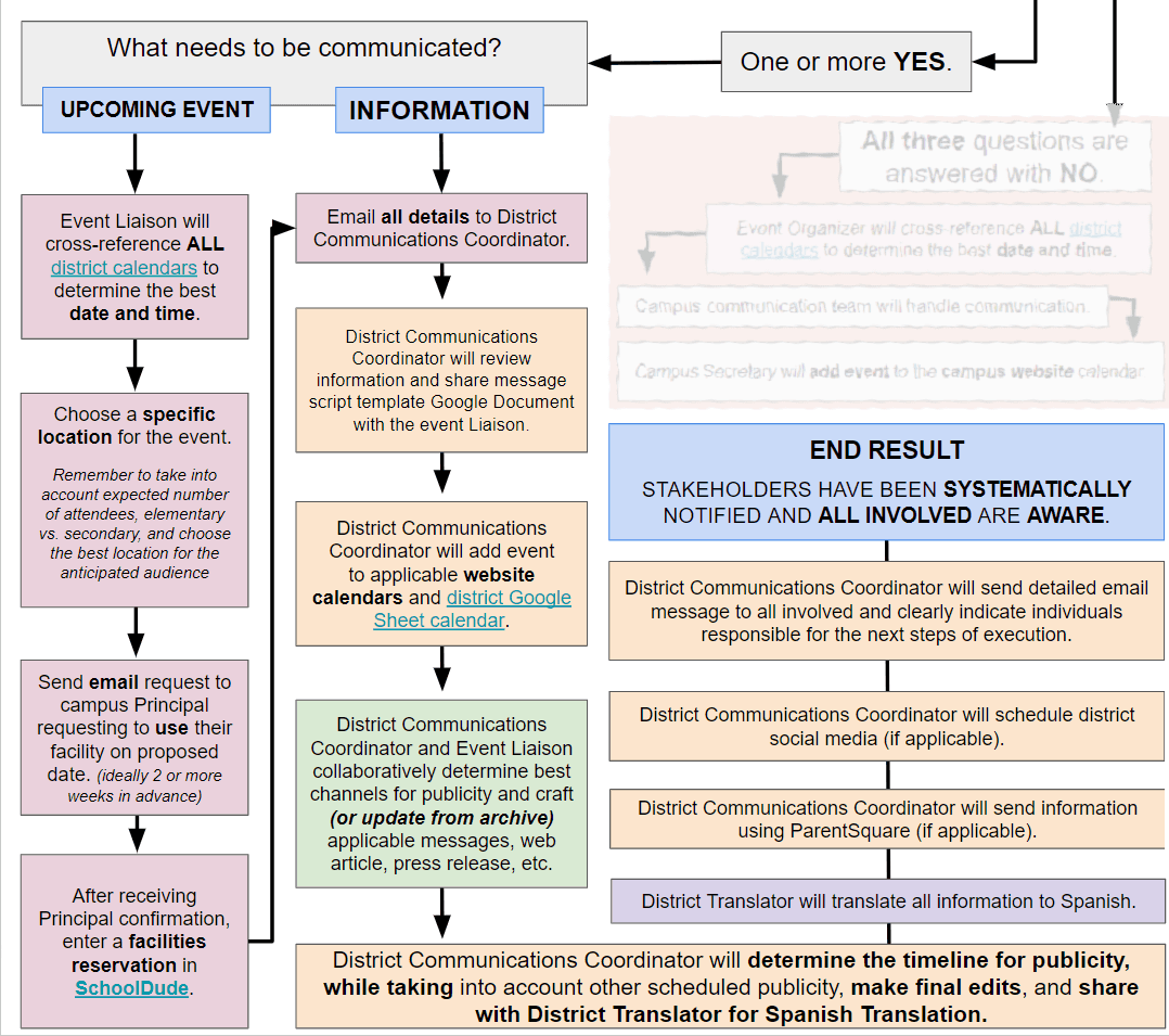 Information: The content to be communicated will be clearly defined, ensuring it is accurate, relevant, and tailored to the needs of the intended audience. The district communications coordinator and event liaison will work together to craft the appropriate messages and choose the best channels for dissemination.